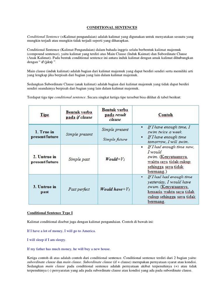 Contoh kalimat conditional sentences type 1, 2, & 3. Berbeda dengan tipe zero, tipe ini dimaksudkan untuk berbicara tentang hal yang terjadi di masa depan. If i come early to school, i will tell you. Example conditional sentence type 1. Contoh conditional sentences (kalimat pengandaian) merupakan kalimat menyatakan suatu tindakan atau peristiwa yang hanya akan terjadi jika syaratnya terpenuhi. If yayan meets lisnah tomorrow, she will be happy. Conditional sentence terbagi empat tipe: Perhatikan dialog conditional sentence type 1 dibawah ini. Rumus conditional sentence type 1. Conditionals types 1 2 3. Contoh kalimat pengandaian dalam bahasa inggris tipe 1. Kalimat conditional sentences type 1 sendiri digunakan untuk menyatakan sesuatu yang kemungkinan besar bisa terjadi jika kondisi yang oleh karena itulah, contohtext kali ini akan membagikan contoh kalimat conditional sentence type 1 beserta artinya agar kita lebih paham dan. Conditional sentence type 2 atau second conditional adalah conditional sentence yang digunakan ketika result/consequence (hasil) dari condition (syarat) tidak memiliki atau hanya sedikit beberapa contoh kalimat conditional type 2 dapat dilihat pada tabel sebagai berikut di bawah ini.
